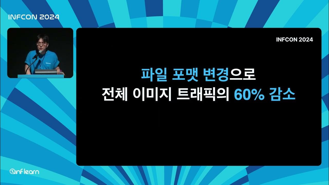 국제화를 준비하는 과정에서 인프런은 트래픽 비용을 크게 개선하는 목표를 세웠습니다. 해외 트래픽 비용을 줄이기 위해 이미지 트래픽 최적화가 중요한 과정 중 하나였습니다. 기존에 사용되던 png, jpg 이미지 포맷 대신 avif 포맷을 도입하여 이미지 크기를 대폭 줄였습니다. avif 포맷은 품질 손상 없이 고율 압축이 가능하여 트래픽 비용을 60% 이상 절감할 수 있었습니다.