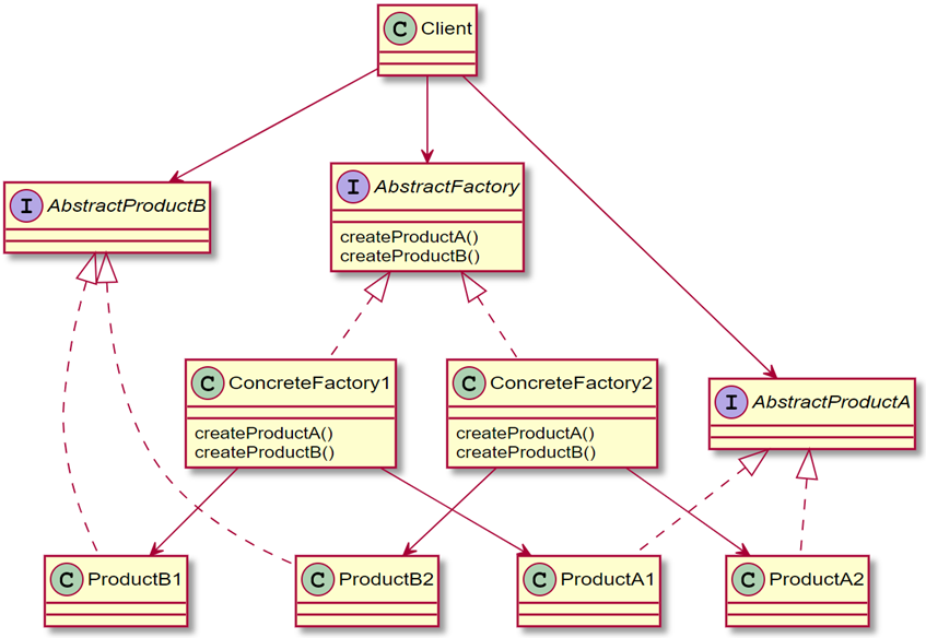 2) 클라이언트는 캡슐화된 인터페이스를 사용하여 목적에 맞는 객체를 생성한다.