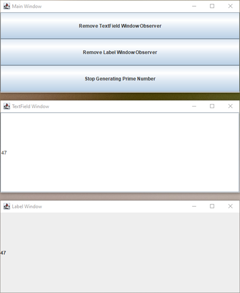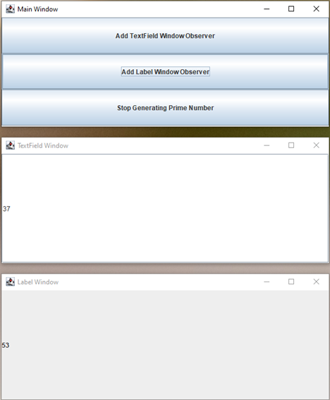 과제 : 옵저버 패턴을 이용해서 쓰레드에서 생성되는 소수를 두 개 옵저버 GUI 화면에 출력하는 프로그램을 작성